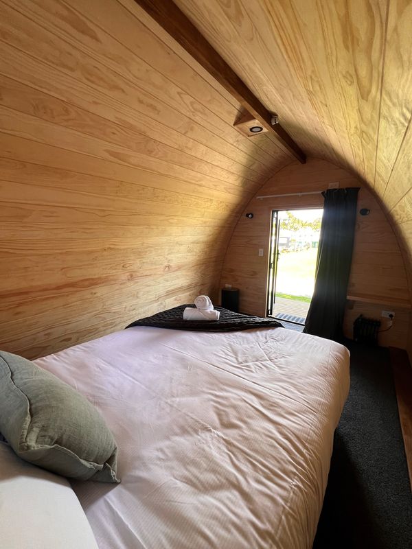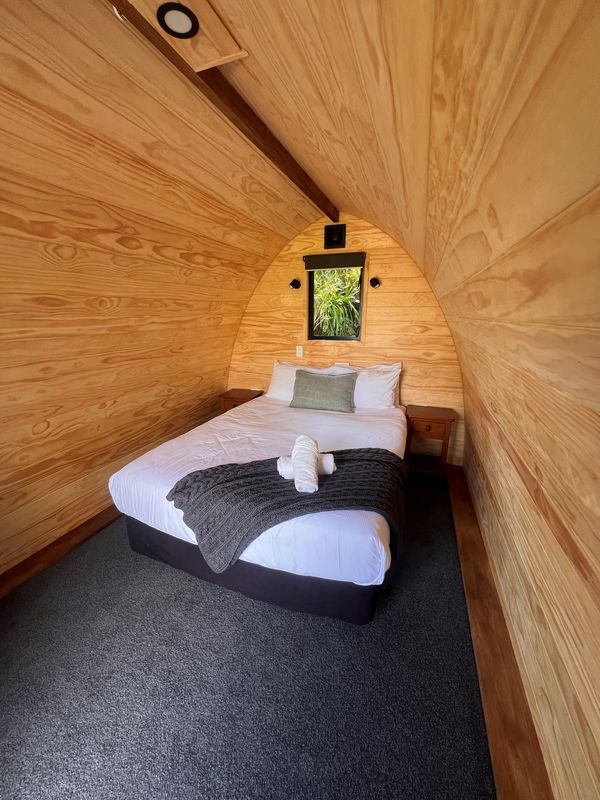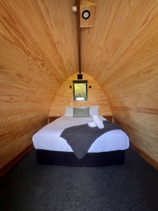 Our cosy wooden pods offer a unique and inviting stay in our campground. Featuring natural timber interiors, a comfortable queen bed for two with crisp linens and thoughtful touches like fresh towels and a warm throw, these pods are designed for comfort and simplicity. A small window frames the surrounding greenery, bringing light and a touch of nature indoors – the perfect retreat after a day of exploring.